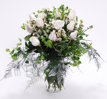 This lovely vase arrangement features 12 white Roses, white filler, a mixture of greens in a glass vase