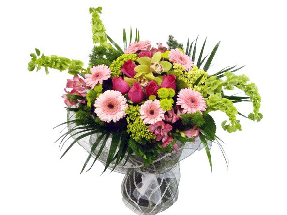 This stunning bouquet features Roses, Gerberas, mini Hydrangeas, Bell of Ireland, Orchids, Alstromeria, filler, button Mums and exotic greens